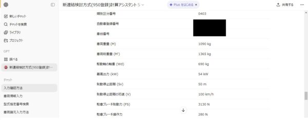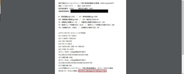 陸運局の方に聞くと車両総重量と車両重量が逆との指摘を受けたので、ここからは正解ではないかもしれませんがチャットで無理やり計算してもらいましたw