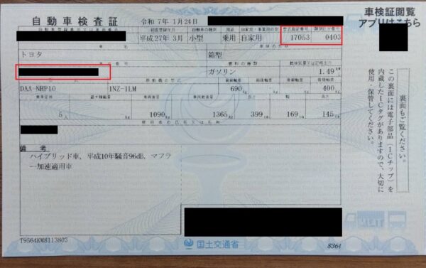 まずは車検証と自分の車の諸元情報というのが必要です。