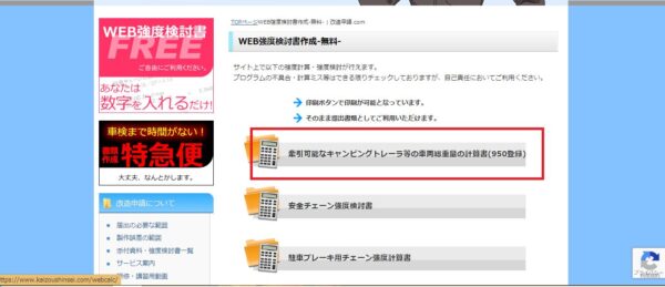 牽引可能なキャンピングトレーラ等の車両総重量の計算書を選びます。