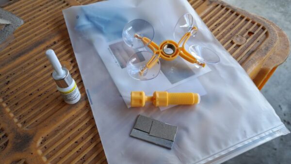 付属のカミソリでガラスの破片を除去したらガラスに付属の器具を取り付けます。